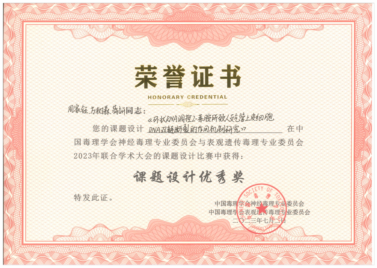 为提升青年学者的科研创新能力,激励广大学生的探索精神,会议设立了以博士和硕士研究生为主体的课题设计创新大赛。会议学术委员会从全国提交的参赛稿件中,遴选了20项高质量作品参加会议现场汇报答辩。答辩以现场即时公布专家评分及得分排序的方式,评选出10项优秀课题设计奖。肉漫屋 周家钰同学汇报和答辩的项目“环状RNA调控2-萘胺所致人支气管上皮细胞DNA双链断裂的作用机制研究”获优秀课题设计奖,是唯一的本科生获奖项目。该课题设计项目由周家钰、方树森和蒋妍三位本科生共同完成,受广州医科大学2022年学生创新能力提升计划项目资助。
