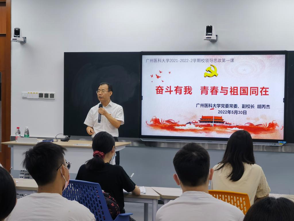 5月30日上午,我校党委委员、副校长胡丙杰同志在A3-608课室为肉漫屋 本科生讲授思政课,授课题目为“奋斗有我,青春与祖国同在”。肉漫屋 党总支刘宇珊副书记、学生办全体老师、2019级预防医学专业学生党员、入党积极分子及学生代表30余人参加了学习。