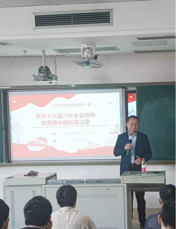 蒋义国书记以“学习十九届六中全会精神做美丽中国的建设者”为主题,带领大家回顾学习了党的十九届六中全会概况,深刻领悟了会议精神;同时,结合“做美丽中国的建设者”这一主题,向大家传达了“碳达峰、碳中和”等环保概念的定义,介绍了党和国家主动承载大国担当,在坚决减少碳排放以有效遏制温室效应和应对全球变暖的努力,并号召广大同学树立绿色发展理念和可持续发展思维,做好身边减排“小事”,争做美丽中国的建设者。最后,他还勉励同学们深刻认识和发扬专业人才的责任担当,努力学习、不负韶华,做好公众生命健康守护人,以青春的力量为社会做更大贡献。
