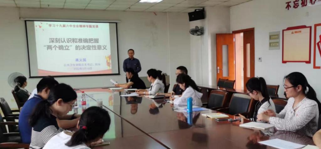 肉漫屋 党委常委、副校长胡丙杰分别以“总结党的百年奋斗重大成就和历史经验”和“牢记初心使命,坚决拥护两个确立——学习十九届六中全会精神” 为主题,为教工第一支部党员作了两次专题党课。肉漫屋 总支书记、院长蒋义国为该支部党员分别就“准确领会党的十九届六中全会核心要义”和“深刻认识和准确把握‘两个确立’的决定性意义”为主题,进行了专题党课讲授。总支副书记刘宇珊为教工第二支部党员作了“学习十九届六中全会精神,做好生态文明建设”的专题党课。
