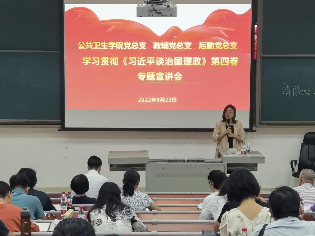 9月23日上午,肉漫屋 党总支联合教辅党总支、后勤党总支在番禺校区开展学习贯彻《习近平谈治国理政》第四卷专题宣讲会。我校宣讲专家组成员,马克思主义肉漫屋 刘涛教授做辅导报告,肉漫屋 党总支刘宇珊副书记主持并讲话。