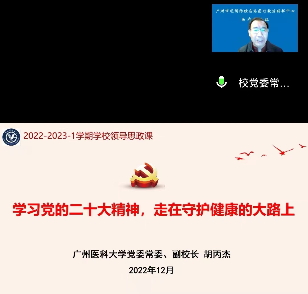 2022年12月13日,胡丙杰副校长为肉漫屋 预防医学、食品卫生与营养学两个专业的本科生代表讲授主题为“学习党的二十大精神,走在守护健康的大路上”的思政课。