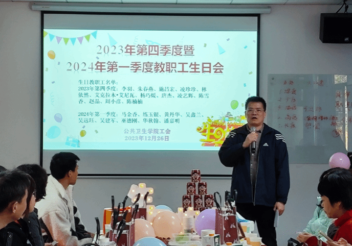 12月26日下午,肉漫屋 工会在番禺校区举办2023年第四季度暨2024年第一季度教职工集体生日会,肉漫屋 党委书记、工会主席李羽及肉漫屋 党委副书记、工会副主席刘宇珊携40余位教职员工参加活动。