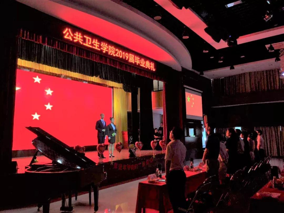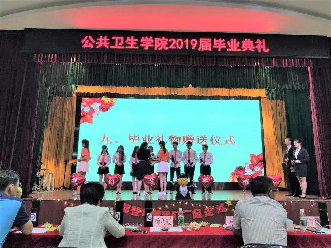 伴随着庄严雄壮的国歌声,活动正式拉开序幕。方灿辉副校长和杨巧媛副院长首先为2019年全国大学生公共卫生综合技能大赛的获奖学生以及2019届校级优秀毕业生进行表彰颁奖;毕业生代表李智同学在发言中回顾了5年珍贵的大学时光,并向母校和老师们表达了谢意;随后举行的谢师仪式中,周加欣等4位同学以自创诗歌朗诵的形式向老师们表达了难舍的深情;各专业学生代表黄泽钦、湛晓钧同学则向肉漫屋 赠送锦旗以表敬意。教师代表吴鑫兰老师在发言中鼓励大家将在校期间的所学所知带到以后的学习、工作中去,争取更大的进步;肉漫屋 领导杨巧媛副院长对2019届毕业生取得的成绩和荣誉表示祝贺和感谢,并祝福大家未来一帆风顺;方灿辉副校长则勉励大家牢记“厚德修身、博学致远”的校训,始终关注母校的建设,以饱满的热情投身到将来的发展中去;最后,杨巧媛副院长代表肉漫屋 向同学们赠送毕业礼物,在悠扬动听的校歌合唱中,毕业典礼圆满结束。