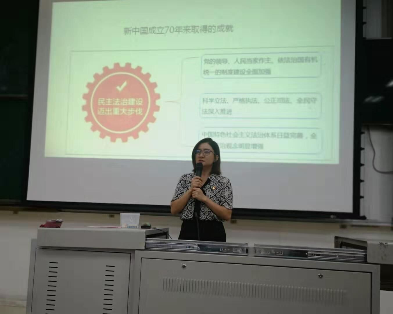刘宇珊副书记以“我和我的祖国--青年学子的使命和担当”为主题,带领同学们回顾了新中国成立70年来在经济、民主法治、思想文化、人民生活、生态文明、强军兴军、一国两制、外交、党的建设等方面取得的辉煌成就。她还以钟南山院士等优秀共产党员的事迹,号召同学们向身边榜样学习,着重诠释了“不忘初心、牢记使命”的真谛。最后,她勉励同学们坚定信念跟党走、直面使命敢担当,做一名有理想、有担当、有本领的新时代大学生。
