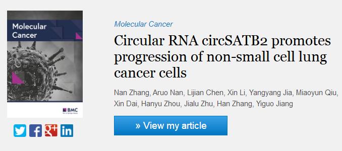 2020年6月3日,著名杂志Molecular Cancer以长篇文章形式,在线发表了肉漫屋 研究生张楠研究论文“Circular RNA circSATB2 promotes progression of non-small cell lung cancer cells”。论文第一作者张楠为肉漫屋 2018级博士研究生,通讯作者为导师蒋义国教授。Molecular Cancer是国际肿瘤学一区杂志,影响因子10.6。这是蒋义国教授课题组自2019年以来,发表的第3篇10分以上高水平杂志论文。