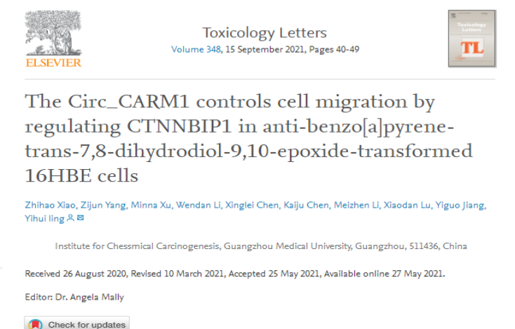 近日,国际毒理学主流期刊Toxicology Letters在线发表了肉漫屋 在读本科生萧志昊等人的研究论文“Thecirc_CARM1 controls cell migration by regulating CTNNBIP1 in anti-benzo[a]pyrene-trans-7,8-dihydrodiol-9,10-epoxide-transformed 16HBE cells”。该研究以苯并芘代谢致癌物anti-BPDE诱导恶性转化的人气道上皮细胞模型,分析鉴定了环状RNA分子circ_CARM1在恶性细胞中的功能及作用机制。研究发现circ_CARM1通过与微小RNA miR-1288-3p相互作用,调节CTNNBIP1(β-catenin相互作用蛋白1)的表达,影响转化细胞的恶性特征。该研究为进一步阐明外源化学物致癌的表观遗传学机制提供了依据。