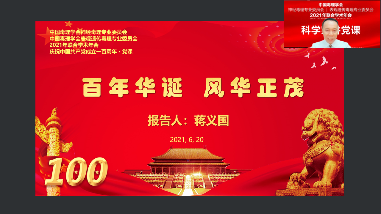 会议主席,肉漫屋 蒋义国教授,在会议期间为两个专业委员会委员和参会的中共党员作了题为“庆祝中国共产党成立100周年----百年华诞,风华正茂”的“科学家讲党课”报告。20日晚上,还召开了专业委员会会议。表观遗传毒理专业委员会秘书长,肉漫屋 吴建军教授,和新当选的副秘书长周芸教授,分别主持和发言。专委会主任委员蒋义国教授,就学会如何更好为会员和委员做好学术指导和服务,作了引导性讲话。