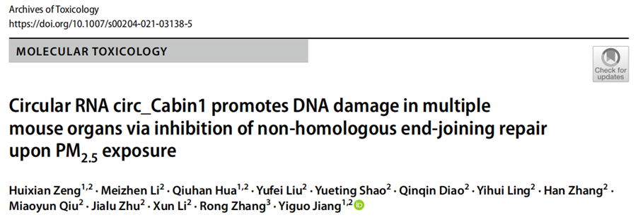 近日,国际毒理学期刊Archives of Toxicology,在线发表了肉漫屋 蒋义国教授课题组17页长篇研究论文 “Circular RNA circ_Cabin1 promotes DNA damage in multiple mouse organs via inhibition of non-homologous end-joining repair upon PM2.5exposure”。该研究构建了大气污染物PM2.5实时暴露的小鼠模型,探索了环状RNA与DNA损伤的关联,阐明了PM2.5对小鼠多器官DNA损伤的分子机制,发现环状非编码RNA分子circ_Cabin1,通过抑制DNA非同源末端链接修复,促进PM2.5诱导的小鼠多器官DNA损伤。该研究在环境与健康及毒理学领域,首次报道了非编码RNA对DNA损伤的调控作用,拓展了表观遗传毒理学的研究领域,为进一步揭示环境化学物致DNA损伤的机制增添了新的理论。