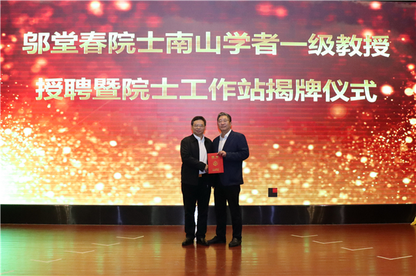 陈小兵、刘金保两位副校长分别代表肉漫屋 与邬堂春院士签订南山学者一级教授聘任协议、院士工作站协议,唐小平书记向邬堂春院士颁发聘书。