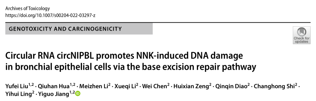 2022年4月18日,肉漫屋 蒋义国教授课题组在国际毒理学权威期刊Archives of Toxicology发表了17页的长篇研究论文“Circular RNA circNIPBL promotes NNK‑induced DNA damage in bronchial epithelial cells via the base excision repair pathway”。该研究受国家自然科学基金重点项目资助。