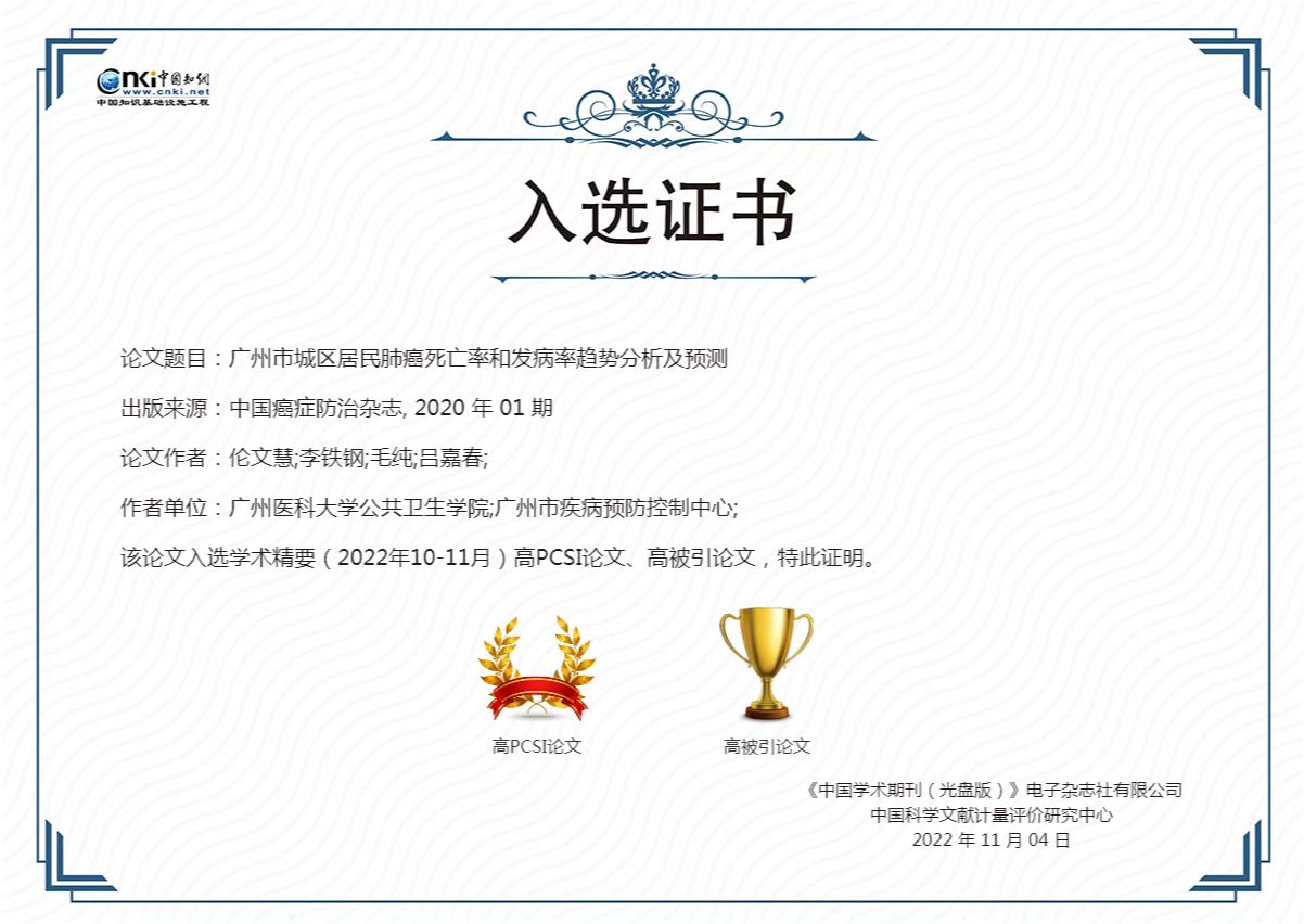 近日,中国知网《学术精要数据库》发布近12年(2011—2022年)中文高影响力论文。该中文数据库分别按照PCSI指数(论文引证标准化指数)、被引频次和下载频次遴选出学科前1%的论文,即高PCSI论文、高被引论文及高下载论文。我校肉漫屋 预防医学专业2019届本科毕业生伦文慧同学2020年发表于《中国癌症防治杂志》的论文《广州市城区居民肺癌死亡率和发病率趋势分析及预测》,入选学术精要(2022年10-11月)高PCSI论文、高被引论文。