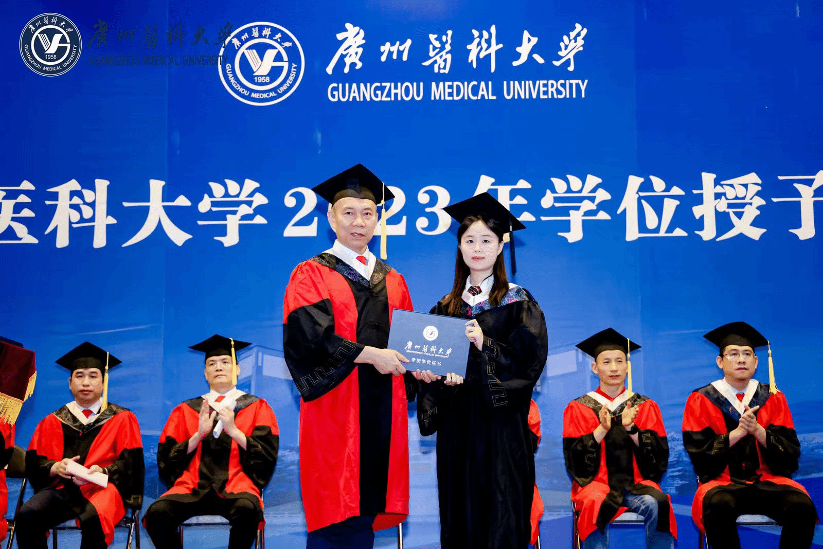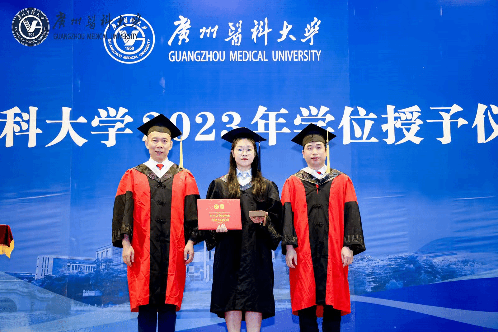 蒋义国院长为115名本科毕业生颁发学士学位证书;并与袁俊副主任一起为首届“卫生应急特色班”的毕业生颁发专业方向学习证明。