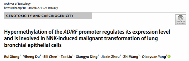 2023年10月1日,肉漫屋 杨巧媛教授课题组研究论文“Hypermethylation of the ADIRF promoter regulates its expression level and is involved in NNKinduced malignant transformation of lung bronchial epithelial cells” 在线发表,本研究揭示了ADIRF基因启动子区5mC甲基化修饰促进ADIRF mRNA和蛋白表达,参与烟草致癌物4-(甲基亚硝基氨基)-1-(3-吡啶基)-1-丁酮(NNK)致肺上皮细胞恶性转化,是课题组NNK致肺癌表遗传学机制系列研究的深入探索。本研究成果发表于国际毒理学权威杂志Archives of Toxicology。
