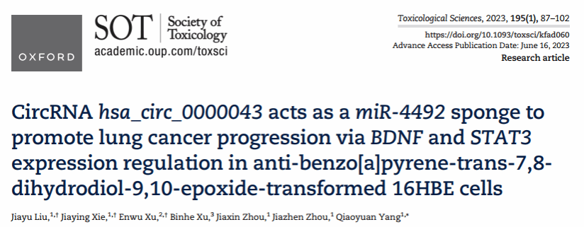此前,杨巧媛教授课题组另一研究成果“CircRNA hsa_circ_0000043 acts as a miR-4492 sponge to promote lung cancer progression via BDNF and STAT3 expression regulation in anti-benzo[a]pyrene-trans-7,8- dihydrodiol-9,10-epoxide-transformed 16HBE cells”于2023年6月28日发表于毒理学另一国际权威期刊Toxicological Sciences。研究发现并证实 环状RNA has_circ_0000043在致癌物苯并[a]芘-反式-7,8-二醇-9,10-环氧化物(BPDE)诱导的人支气管上皮细胞恶性转化中发挥重要调控作用,揭示了hsa_circ_0000043作为肺癌诊断标记和治疗靶点的潜力。