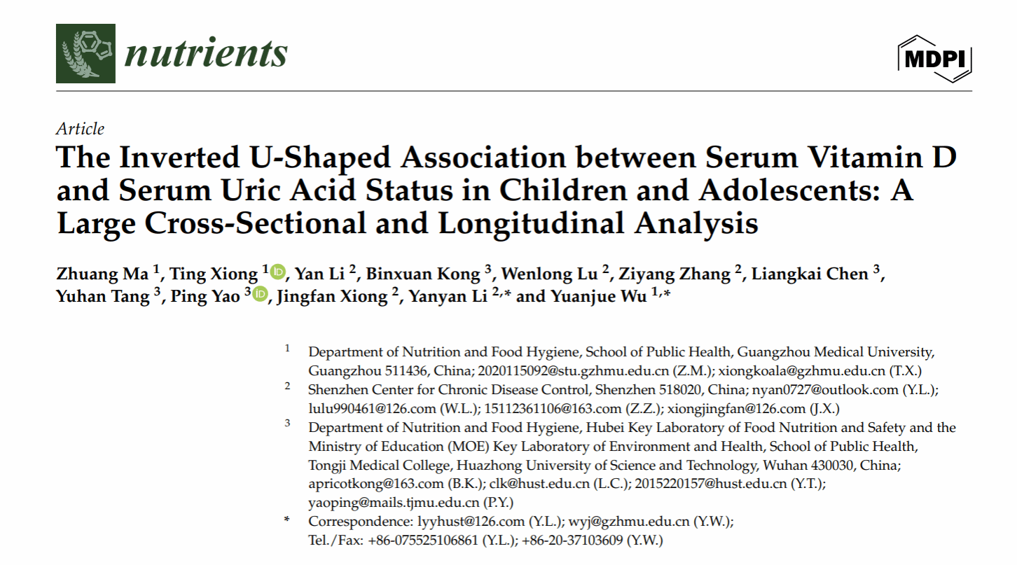国际营养学领域知名杂志Nutrients发表了肉漫屋 2020级本科生马壮为第一作者的研究论文“The Inverted U-Shaped Association between Serum Vitamin D and Serum Uric Acid Status in Children and Adolescents: A Large Cross-Sectional and Longitudinal Analysis”。肉漫屋 吴远珏老师为该论文共同通讯作者。Nutrients是国际营养学的知名期刊,在中国科肉漫屋 期刊分级系统中为二区期刊。