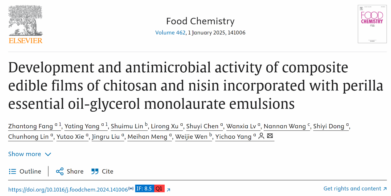 近期,国际食品科技与营养学领域知名杂志Food Chemistry发表了肉漫屋 2019级本科生方展彤和2020级本科生阳亚婷为共同第一作者的研究论文“Development and antimicrobial activity of composite edible films of chitosan and nisin incorporated with perilla essential oil-glycerol monolaurate emulsions”。肉漫屋 杨艺超老师为该论文的唯一通讯作者。 Food Chemistry是国际食品科技与营养学的知名期刊,在中国科肉漫屋 期刊分级系统中为一区期刊。