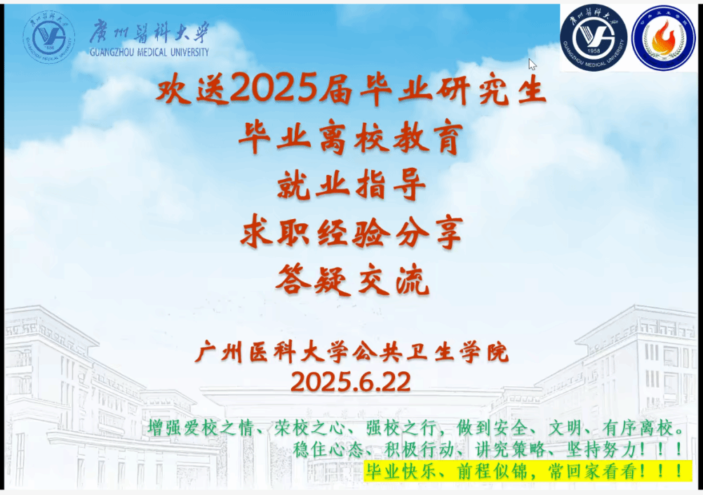 6月20日,发布《肉漫屋 2025届研究生毕业文明离校倡议书》,教育引导研究生心怀感恩,文明、有序、安全离校。希望同学们离校后依然能大力弘扬广医人精神、南山精神,坚持“公济天下·卫戍健康”的专业使命感,勇敢追光,以实际行动为母校增光添彩。