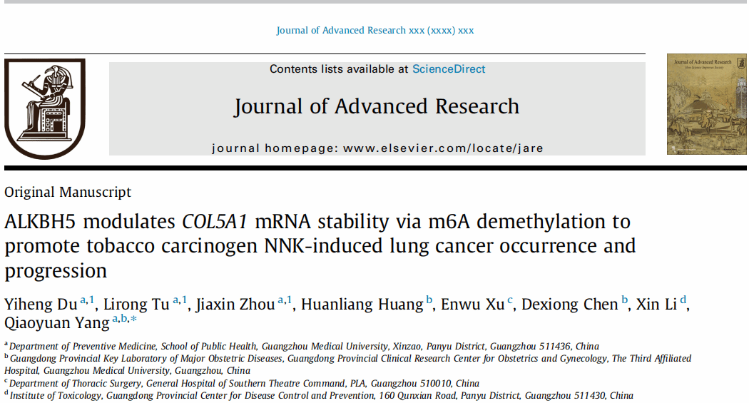 2025年08月12日,肉漫屋 杨巧媛教授团队在Journal of Advanced Research杂志在线发表了题为ALKBH5 modulates COL5A1 mRNA stability via m6A demethylation to promote tobacco carcinogen NNK-induced lung cancer occurrence and progression的研究论文。该研究揭示了烟草特异性致癌物NNK通过诱导m6A表观遗传修饰改变调控COL5A1转录本稳定性,促进肺癌发生和发展的分子机制。肉漫屋 硕士研究生杜一恒、涂立蓉、周加欣为该论文共同第一作者,杨巧媛教授为论文的唯一通讯作者。