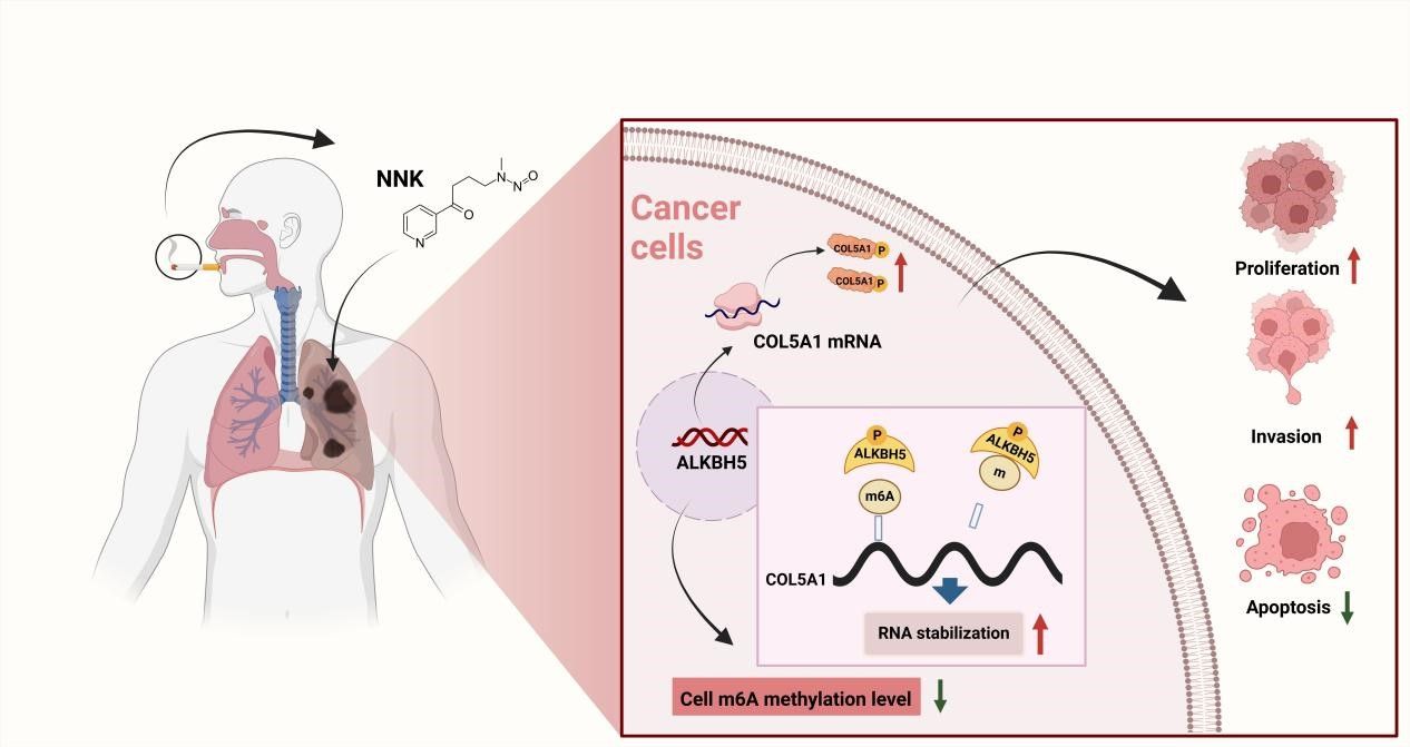该研究首次揭示,烟草特异性致癌物NNK可诱导支气管上皮细胞及肺癌组织中的整体m6A甲基化水平显著降低,提示m6A异常修饰在环境致癌物驱动的肺癌发生中起关键作用。通过整合MeRIP-seq与RNA-seq数据,发现了一个具有高致癌潜力的基因COL5A1,该基因在肺癌中表达显著上升且其m6A修饰水平明显下降,COL5A1敲低可有效抑制肺癌细胞的增殖、迁移与侵袭能力,并诱导细胞凋亡;机制层面,本研究发现去甲基化酶ALKBH5在NNK暴露下表达上调,通过特异性去除COL5A1 mRNA上的m6A修饰,增强其转录本稳定性及蛋白翻译效率,从而显著强化细胞的恶性表型。该研究创新性地将环境致癌物NNK、m6A表观转录调控与肺癌发生发展联系起来,深化了对吸烟相关肺癌分子机制的理解,也为烟草相关肺癌的早期干预提供了新思路。ALKBH5–COL5A1轴作为该通路的核心调控环节,具有重要的转化医学价值,有望成为预防或治疗吸烟相关肺癌的新型靶点。