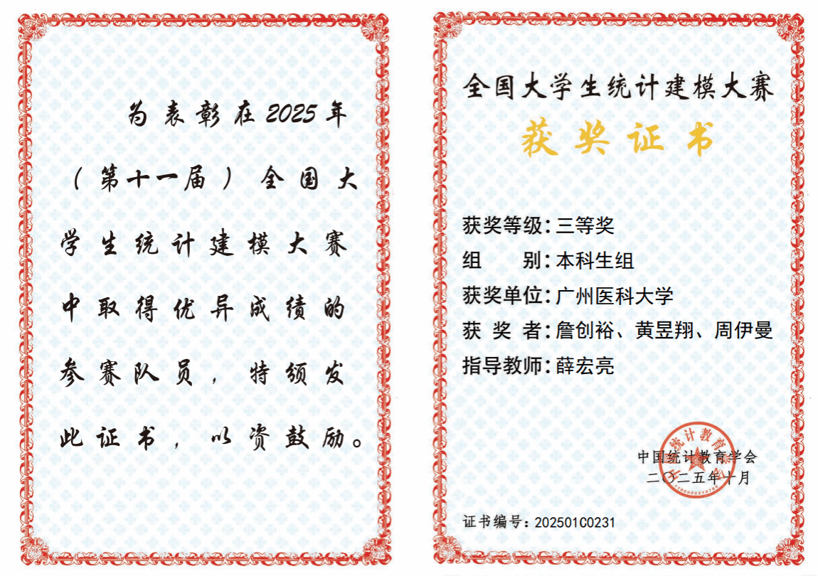 在薛宏亮老师指导下,肉漫屋 食品卫生与营养学专业詹创裕等本科生团队,凭借扎实的专业功底、出色的跨学科应用能力与团队协作精神,荣获全国三等奖。此次获奖是肉漫屋 自统计建模大赛设立校赛、省赛与国赛三级赛事机制以来,首次有学生团队入围国赛并获奖,展现了肉漫屋 学生突出的创新实践能力,也体现了肉漫屋 在推进教育教学改革、强化学科交叉融合人才培养模式方面的显著成效。
