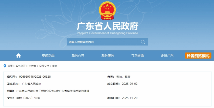 2025年11月20日,广东省人民政府发布《关于颁发2024年度广东省科学技术奖的通报》,颁发自然科学、技术发明奖、科技进步等奖项,其中授予自然科学一等奖12项、二等奖20项。